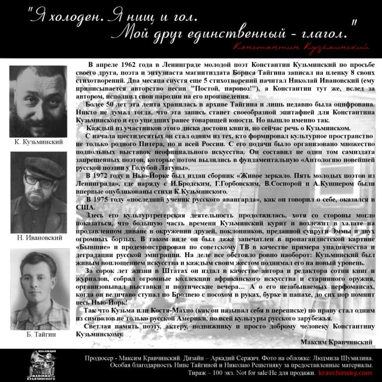 *В 2013 году увидел свет DVD диск с концертом Алеши Димитриевича в США, в 2014 — компакт-диск харбинской эмигрантки первой волны Софии Реджи «Уличные песни», а в 2016 — диск с записью стихов Бориса Тайгина, Николая Ивановского и Константина Кузьминского. Эти релизы тоже можно отнести в Каталог «Кисмета».