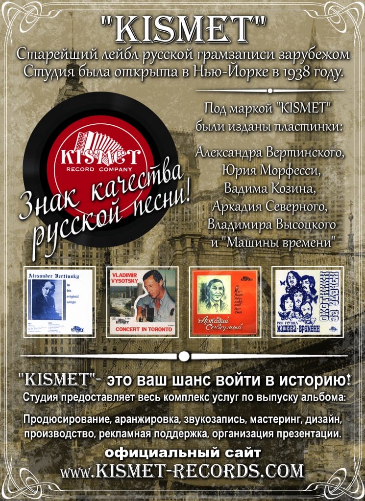 В 2015 году старейший лейбл грамзаписи русского зарубежья «Кисмет» возобновил свою деятельность по выпуску и продюсированию дисков. Хотя каждый релиз издается коллекционным тиражом (от 300 до 500 экз.), выход очередной новинки неизменно сопровождается концертом и презентацией. Информация о новых проектах также анонсируется в рамках моих выступлений с лекциями об истории русской песни.