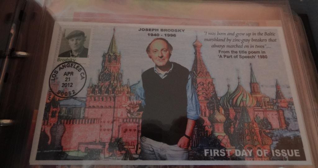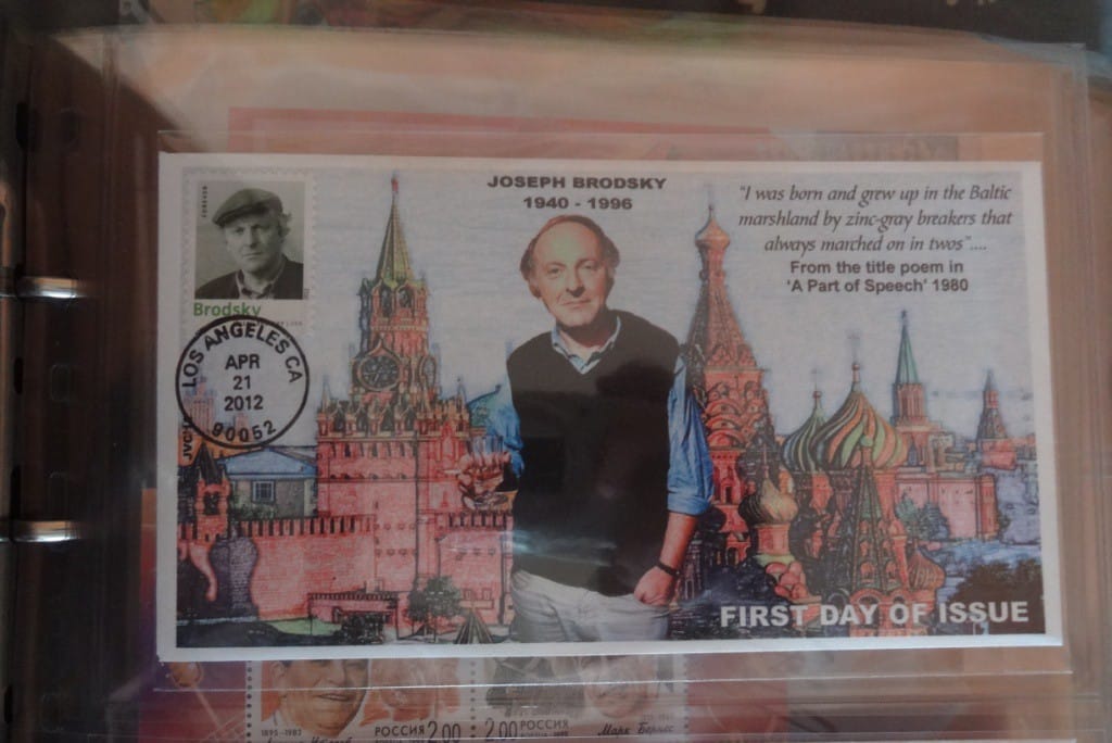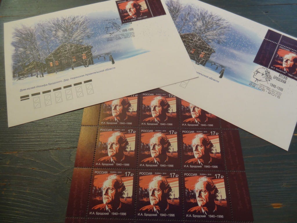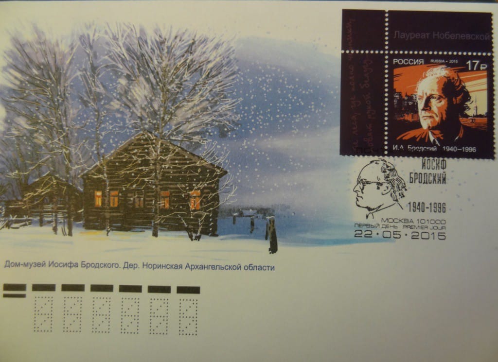 Вчера Иосифу Бродскому исполнилось бы 75 лет. К этой знаменательной дате 22 мая Почта России выпустила юбилейную марку. В течении трех рабочих дней после выпуска и только в почтовом отделении 101000 (ул.Мясницкая, 26) можно осуществить специальное гашение марок на конверте с изображением дома в селе Норенское Архангельской обл., где отбывал ссылку будущий Нобелевский лауреат. Марки никогда не входили в сферу моих интересов, но несколько лет назад я уже приобрел памятную марку с Бродским, выпущенную в Штатах и даже, по счастливой случайности, оказался там в первый день гашения. Поэтому решил приобрести и отечественный знак почтовой оплаты. В процессе операции по спецгашению узнал массу интересного: 1.марки из блока ни в коем случае нельзя вырезать ножницами, а можно только вырывать руками; 2.украшенное пространство вокруг марок называется «художественной частью», по правилам коллекционирования, ее можно сохранять; 3.марка считается погашенной, если печать попала непосредственно на на нее, а не на «художественную часть» (мне 1 конверт запороли); 4.коллекционеры клеют марки на конверты, используя только собственный язык и никогда клей… Мое первое в жизни посещение Главпочтамта принесло массу впечатлений.Если кому интересно, то 1 марка стоит 17 рублей, а конверт — 9, блок марок — 153 рубля. Спецгашение красивым штемпелем — бесплатно. Но… С 14 до 15 перерыв и дядька в окошке категорически шлепнуть печать отказывается! Происходит все во втором зале во втором окошечке с надписью «Филателия», а гасится в первом. На 999 рублей я набрал несколько блоков и конвертов. Буду рассылать знакомым поэтам, конверт с погашенной маркой действителен. Главное теперь, чтобы артефакт не сперли на почте! Поставив точку, я вдруг понял, что марки в моей коллекции все-таки имеются. Это, во-первых, серия «Великие певцы России», где присутствуют и Высоцкий, и Бернес, и Окуджава, и Утесов; во-вторых, редкие итальянские марки с «немецким Шаляпиным» Иваном Ребровым, а также Сергеем Есениным и конверт с Вадимом Козиным.