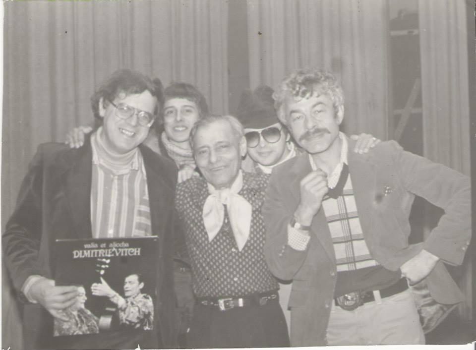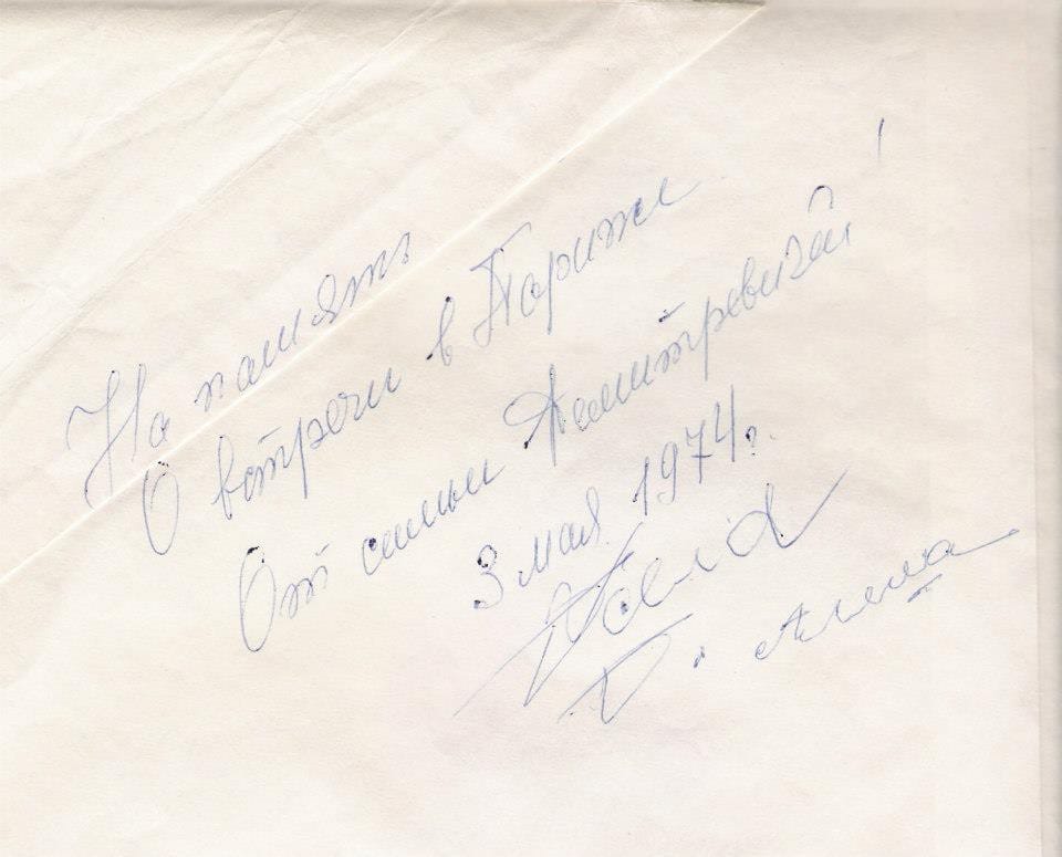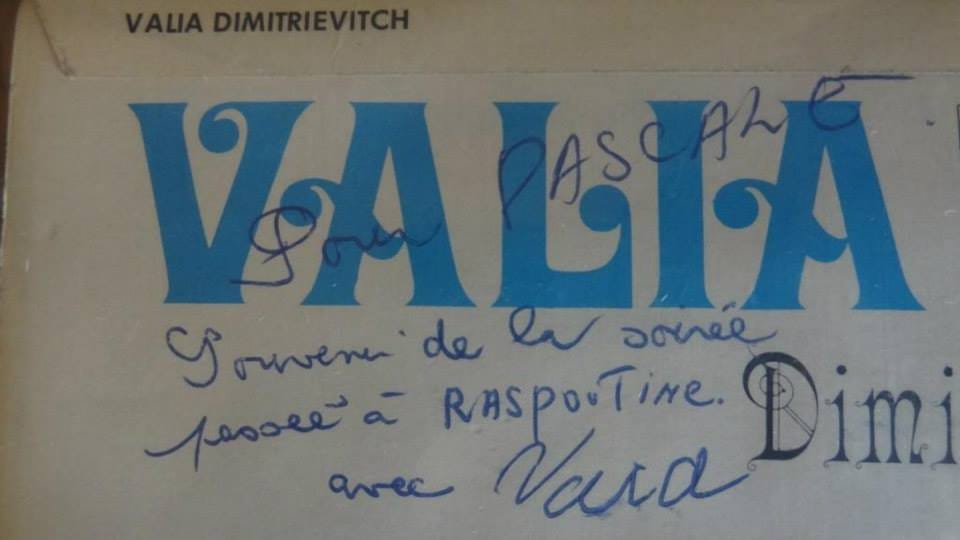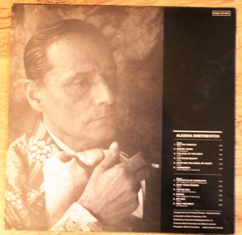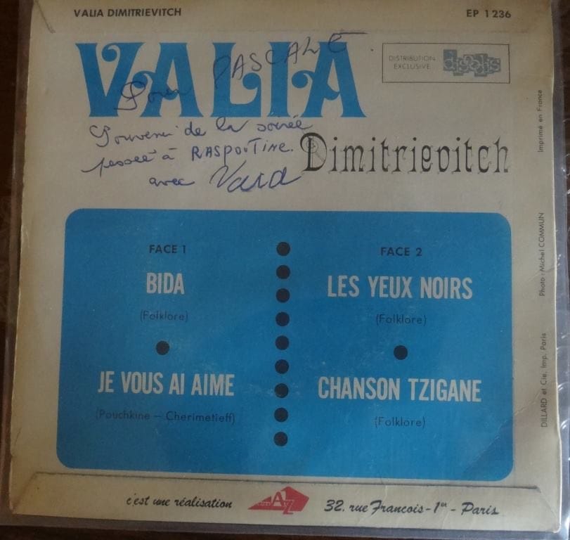 На днях почтальон принес долгожданную посылку с миньоном цыганской певицы Вали Димитриевич. Сам диск — не редкость, но вот автограф Вали на задней стороне конверта делает эту пластинку настоящим раритетом. А главное — теперь у меня в коллекции полный комплект: автографы Вали и самого Алеши. Подпись Алеши можно увидеть на канадском издании его «Белого» альбома, оформленного самим Михаилом Шемякиным. Эту пластинку мне подарил летом 2012 года в Америке легендарный одессит Алик Ошмянский, который в свою очередь приобрел ее на концерте А.Димитриевича в ресторане «Мisha^s» в 1984 году в Лос-Анджелесе. Собственно автограф и предназначается Алику. Там написано: «Многие лета от последнего Алеши Димитриевича«. Интересно, что писал пожелание кто-то другой, так как Алеша был практически неграмотным и мог выводить только свое имя «АЛЕША», что он и сделал в самом низу. Другой аналогичный автограф Димитриевича можно видеть на фото, где Алеша запечатлен в компании с еще одной легендой русской песни, первооткрывателем Аркадия Северного, владельцем студии «Кисмет» Рудольфом Фуксом (слева, с диском в руках). Этот снимок также сделан во время американского турне «парижского цыгана» 1984 года, но уже в Нью-Йорке.