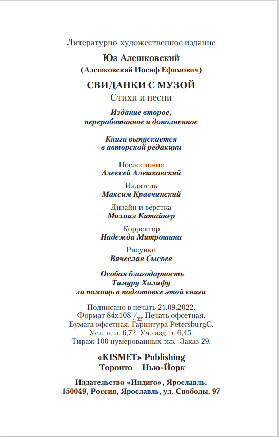 В 2020 году впервые в истории своего существования старейшая фирма русской грамзаписи зарубежом «KISMET Records» пошла на смелый эксперимент — под этим лейблом увидела свет ни очередная пластинка или кассета, а книга — сборник стихов и песен Юза АЛЕШКОВСКОГО «Свиданки с музой». Литературная новинка была выпущена небольшим тиражом в 100 нумерованных экземпляров, однако вызвала значительный интерес со стороны библиофилов, критиков и всех тех, кто интересуется культурой русского зарубежья. Эта книга стала, как оказалось, последним прижизненным изданием в библиографии писателя. Глядя на читательский отклик, эксперимент было решено продолжить и летом 2022 года был издан сборник стихов Саши СОКОЛОВА «Записки запойного охотника» из романа «Между собакой и волком». Как и дебютный проект, книга была издана коллекционным тиражом и в открытую продажу не поступала. Оформил новинку художник Владимир ФОМИН. В октябре презентация «Записок» с успехом прошла в Монреале и теперь уже можно с уверенностью сказать, что на риск «Кисмет» пошел не зря. Успех окрылил. На днях вышло второе издание книги Юза Алешковского, куда было добавлено последнее стихотворение мастера под названием «Подражание Высоцкому» и несколько редких фото. В понедельник, 12 декабря 2022 года в Доме Русского Зарубежья запланирован вечер памяти Юза АЛЕШКОВСКОГО. Подробности будут сообщены позднее. Второе, расширенное и дополненное издание книги «Свиданки с музой», было решено издать специально к этому мероприятию. По сложившейся традиции, тираж книги коллекционный — 100 нумерованных экземпляров. Для заказа пишите мне на электронный адрес, который вы найдете в разделе Контакты. Спешу сообщить, что в конце декабря в Россию прибудут несколько экземпляров книги Саши Соколова «Записки запойного охотника». Обе новинки могут быть высланы как по России, так и заграницу. На все вопросы я каждому отвечу лично. Чтобы посмотреть на первые два литературных проекта издательства «Кисмет», кликайте на ссылки выше, а в галерею я выкладываю сегодня фрагменты нового издания сборника «Свиданки с музой».