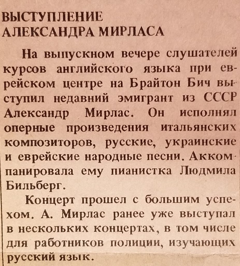 Среди многочисленных русских ресторанов Нью-Йорка, которые в 1970-80-е гг. вспыхивали и гасли, как искры от костра в известном романсе, немногим удалось продержаться, а, тем более, обрести статус легендарного места. Одним из них стал ресторан «Садко», открытый на Брайтон-Бич в начале 1980-х годов предпринимателем Евгением Бендерским. Там в разные годы выступали лучшие артистические силы того времени: Марина Львовская, Алекс Мирлас, Сэм Майклсон, Михаил Шуфутинский, Анатолий Могилевский, Марк Грушко, Леонид Полищуков (это о нем спела Люба Успенская: «Я без ума от гитариста из «Садко»…), заморская гостья из Австралии Рита Каган и, конечно, Люба Успенская. Взгляните на вырезки из эмигрантских газет и архивные съемки. Как от них веет атмосферой того невозвратного времени.