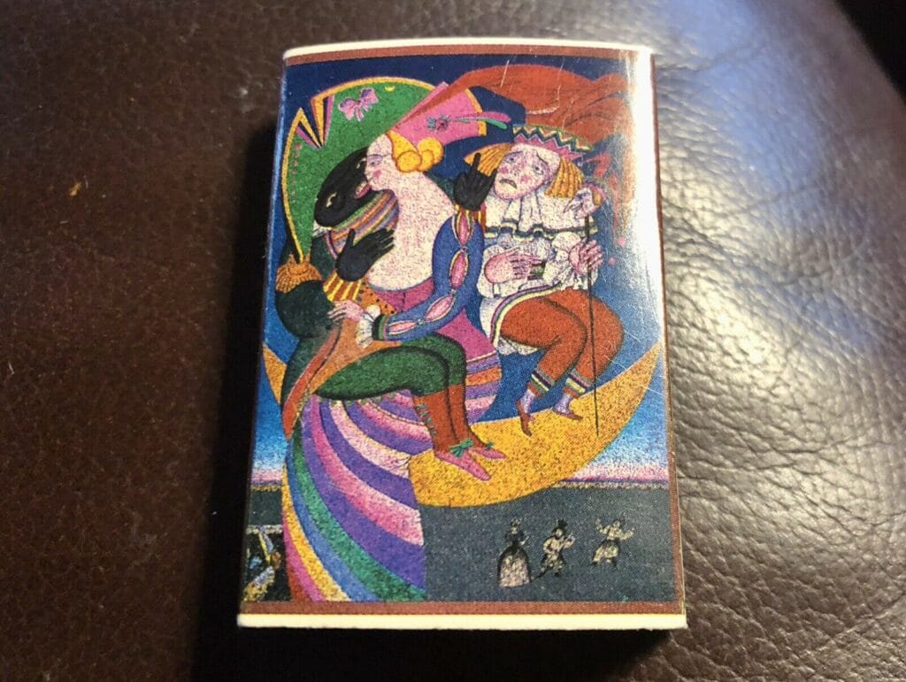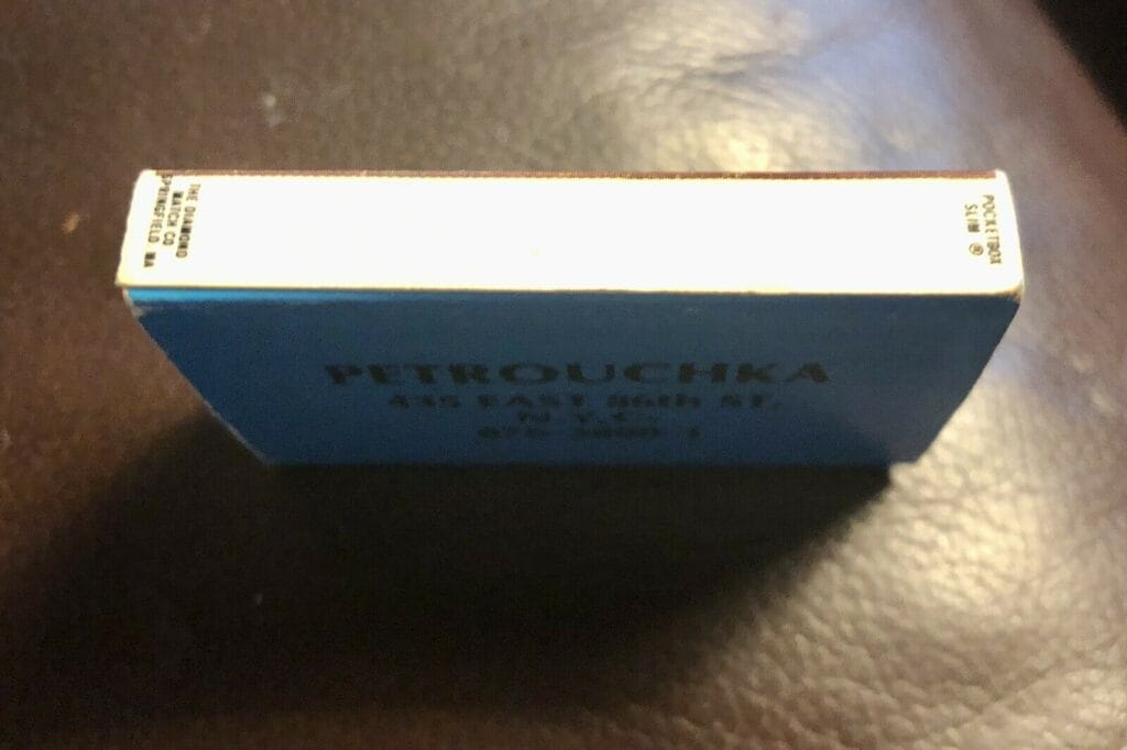 В рекламе указывалось, что вход возможен исключительно в костюмах и вечерних платьях. Оформил интерьеры известный художник Михаил Шемякин, а развлекала гостей певица Майя Розова в сопровождении оркестра. Визитки и спички фешенебельного кабаре также были украшены рисунками Шемякина. Сегодня в моей коллекции хранится несколько таких артефактов, которыми я и предлагаю вам полюбоваться. К сожалению, точки общепита редко входят в сферу серьезных исследований и найти информацию даже о заведениях современных, как, например, «Петрушка», о котором я рассказал, бывает очень непросто. Поэтому я хочу обратиться ко всем гостям моего сайта: если у вас в архиве хранятся фотографии русских ресторанов заграницей, визитки, рекламные открытки, меню и прочие следы эпохи, пожалуйста, напишите мне. Адрес вы найдете в разделе Контакты. До новых встреч.