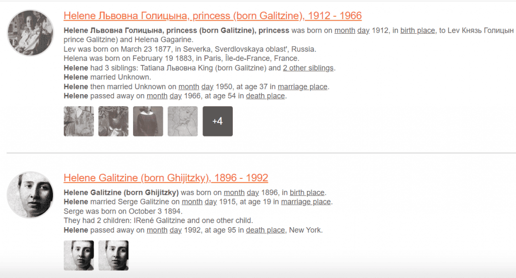 Легендарная фамилия на ресторанном сувенире заинтересовала, и я решил попробовать разобраться, кому же она могла принадлежать. В первой волне эмиграции оказалось немало представителей этого рода. Мне сразу вспомнился Сергей Голицын, чье имя встречается на граммофонных пластинках популярного в 1920-30-е годы певца-эмигранта Юрия Морфесси. «У рояля князь Сергей Голицын» — так писали на этикетках. Но мне, однако, нужно было найти человека с инициалом не «S», а «H». На запрос в Гугле «H.Galitzine» я получил ссылки на двух дам, которые после революции эмигрировали и жили (по крайней мере, какое-то время) во Франции.
