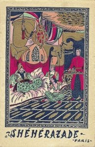 Роскошь интерьеров «Шехерезады» проявлялась даже в незначительных деталях. Владельцы не экономили на мелочах, понимая, что они, наряду с кухней, обстановкой и музыкальной программой, тоже определяют класс ночного клуба. Гости могли взять на память изящные визитные карточки, красивые открытки (которые регулярно обновлялись), а в те дни, когда отмечалась годовщина «Шехерезады», клиентам вручали в подарок памятные буклеты, отпечатанные на дорогой плотной бумаге. Из этих маленьких книжечек можно было узнать историю кабаре, посмотреть фото артистов и именитых завсегдатаев. Недавно мою коллекцию пополнил чудом переживший бурные десятилетия ХХ века необычный предмет. Это – бумажный веер на деревянной ручке. Думаю, что сей артефакт относится к довоенному периоду, когда кондиционеров в помещениях еще не существовало, а гостям вдобавок не воспрещалось курить. Под рисунком можно прочитать название и адрес кабаре: «Sheherazade. Rue De Liege, 3». Если приглядеться, в углу видна подпись художника: H. Galitzine.